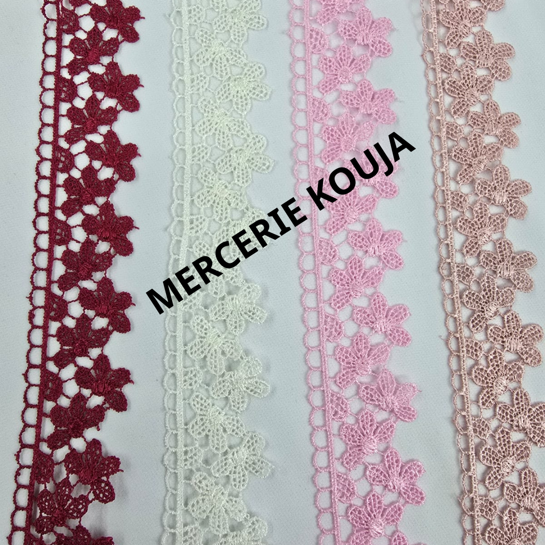 Dantelă fină din poliester cu model delicat de floricele, ideală pentru accesorii, rochii, trusouri și proiecte handmade. Disponibilă în role de 10 yards și o gamă variată de culori elegante și versatile.