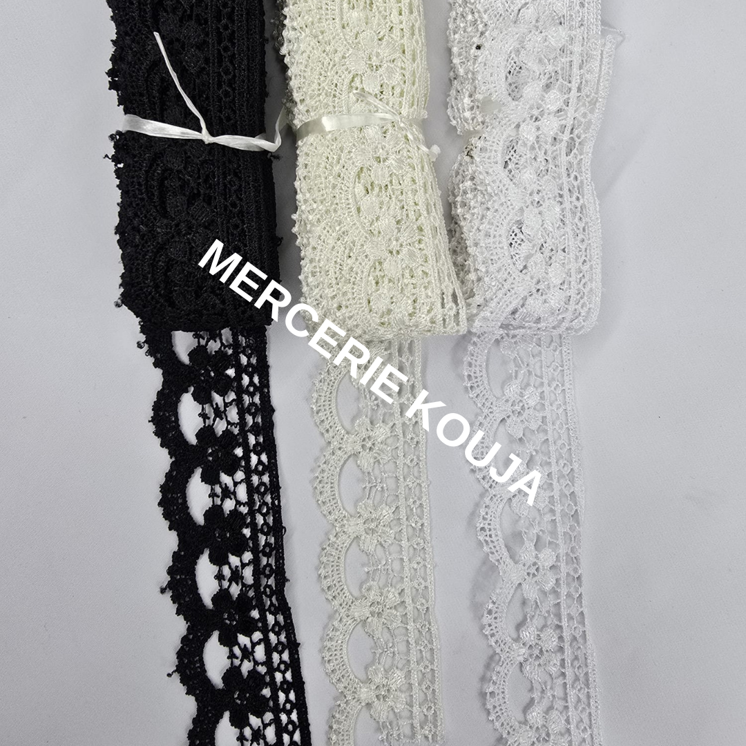DANTELĂ POLIESTER LUXTEX – Lățime 4 cm | 10 YARDS / ROLĂ | Culori: Alb, Crem, Negru