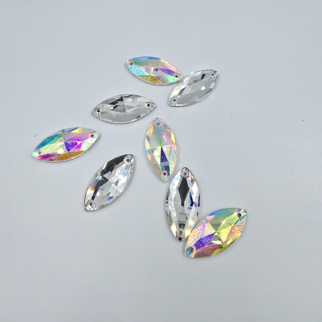 Adaugă detalii strălucitoare și elegante proiectelor tale cu aceste pietre de cusut din sticlă, disponibile în culori argintii (clear) și multicolore (efect AB). Forma lor alungită și finisajul fațetat oferă un efect vizual spectaculos, perfect pentru piese vestimentare și accesorii deosebite.