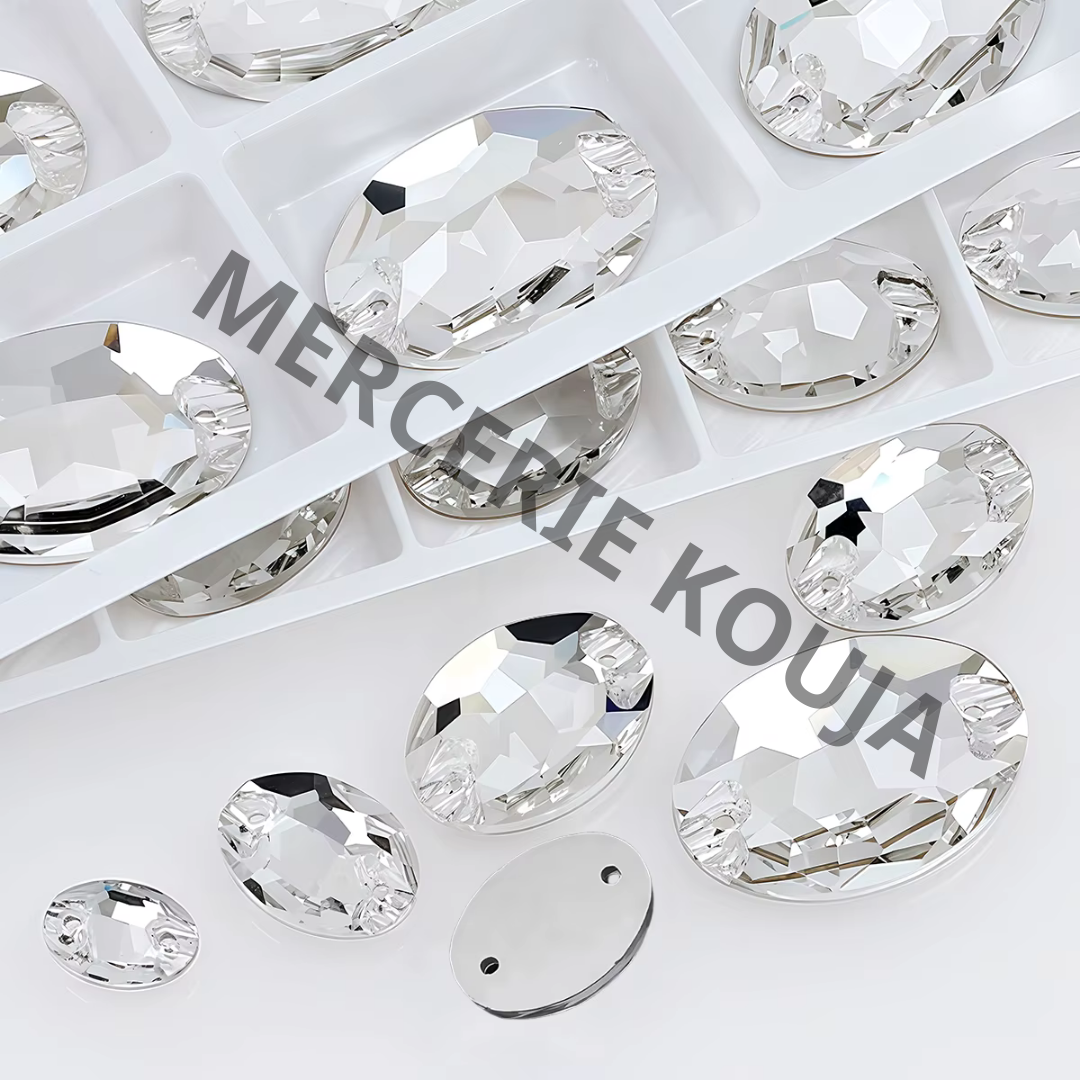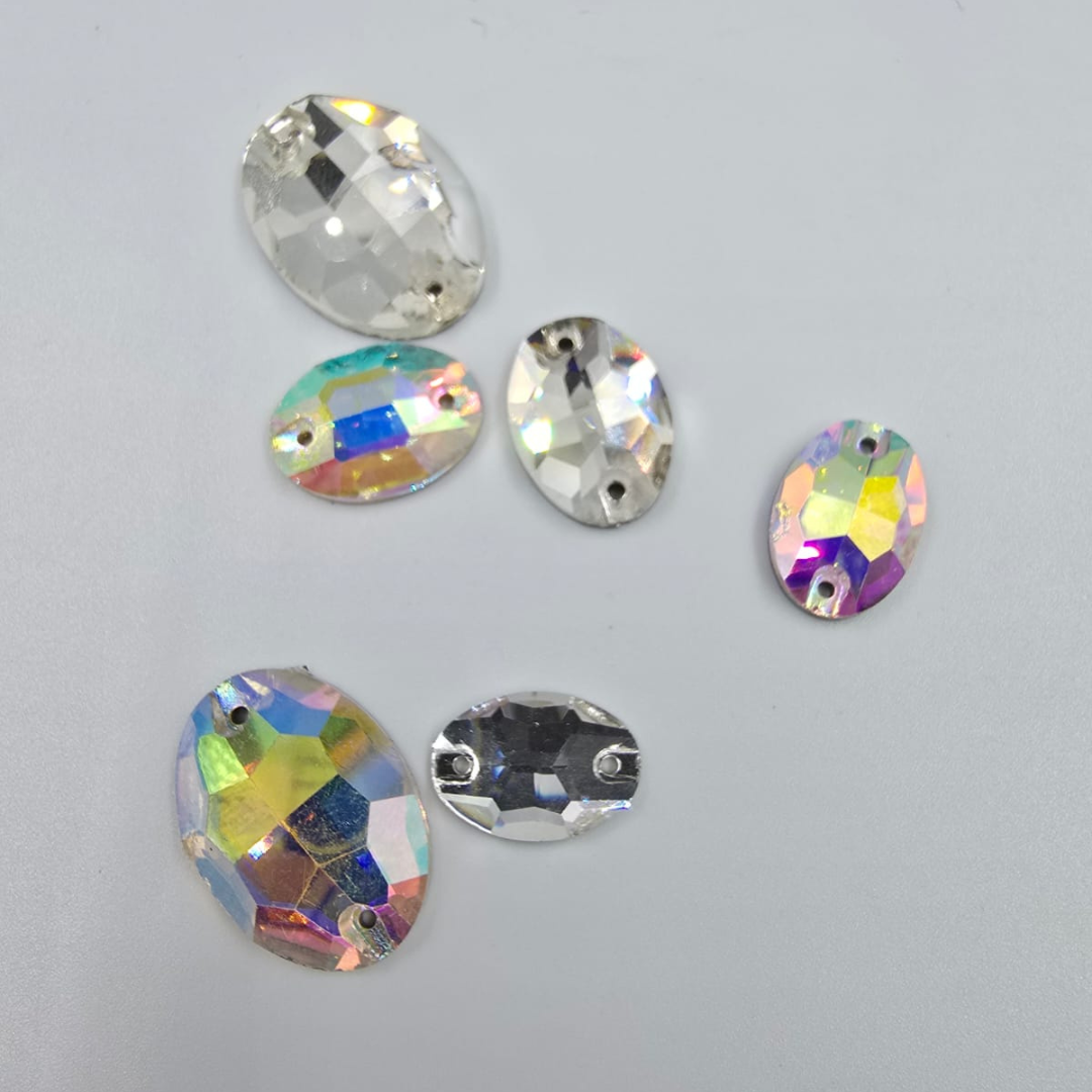 Adaugă un accent elegant și strălucitor creațiilor tale cu aceste pietre de cusut din sticlă în formă ovală, disponibile în culori argintii (clear) și multicolore (AB). Fiecare piatră este șlefuită cu grijă pentru a reflecta lumina spectaculos și este prevăzută cu 2 găuri pentru coasere ușoară și sigură.